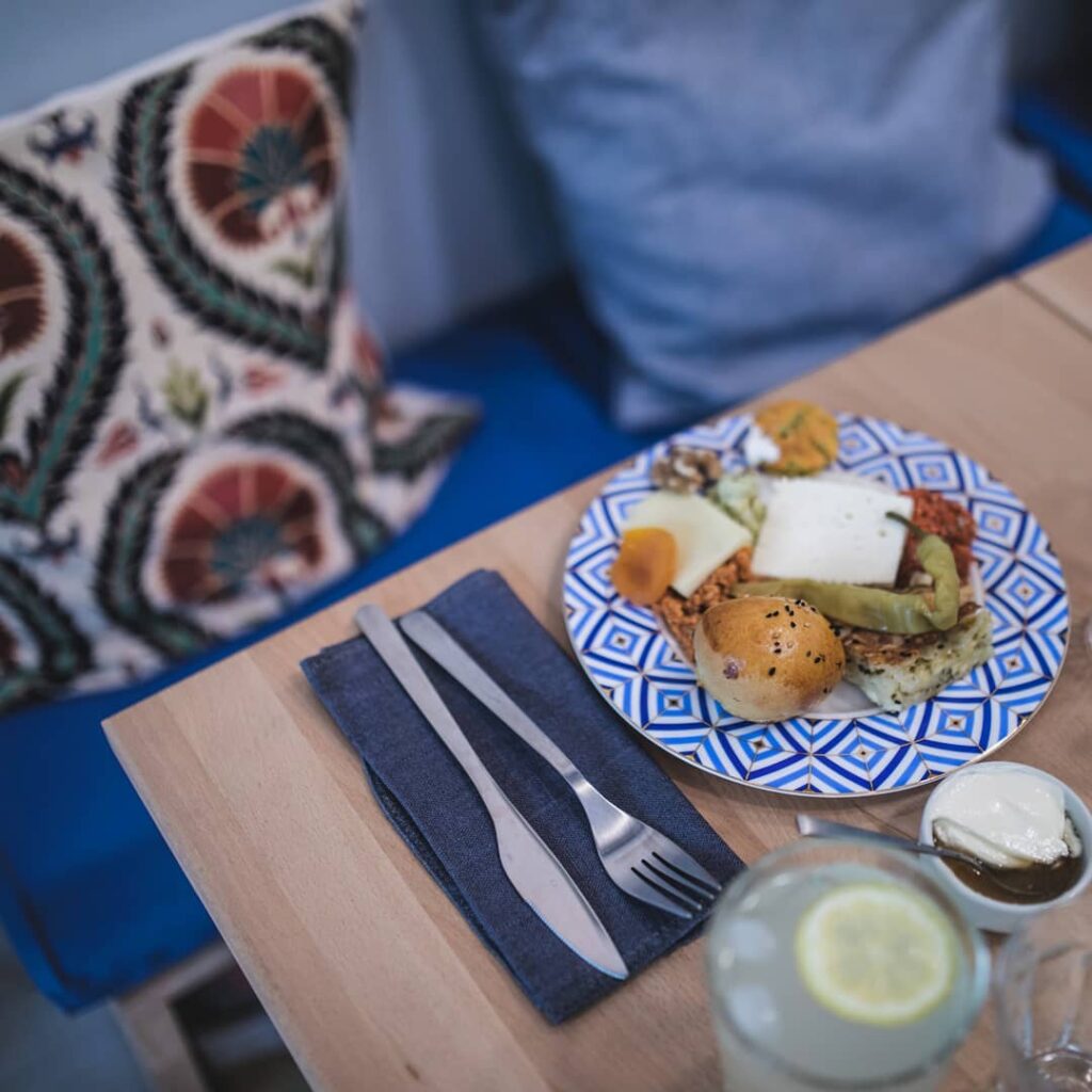 La salle est petite – une dizaine de couverts – mais dès l’entrée, le grand carrelage bleu capte le regard, comme une fenêtre ouverte sur le Bosphore. Banquettes, affiches, livres de cuisine : chaque détail participe à l’atmosphère chaleureuse et dépaysante du lieu.