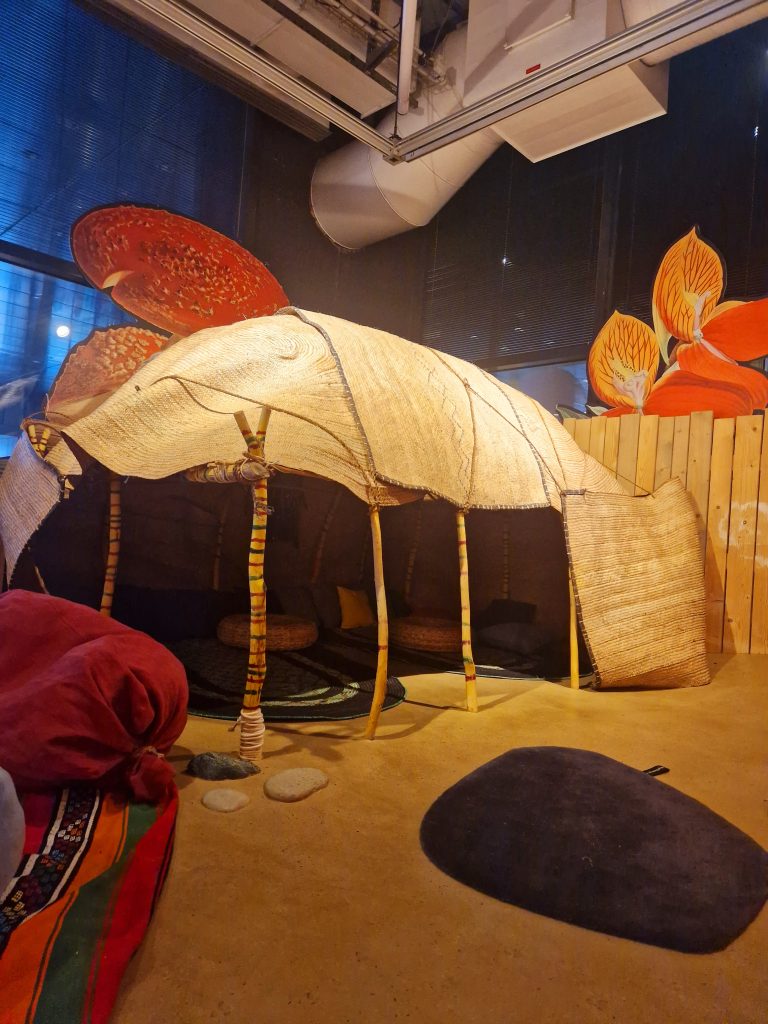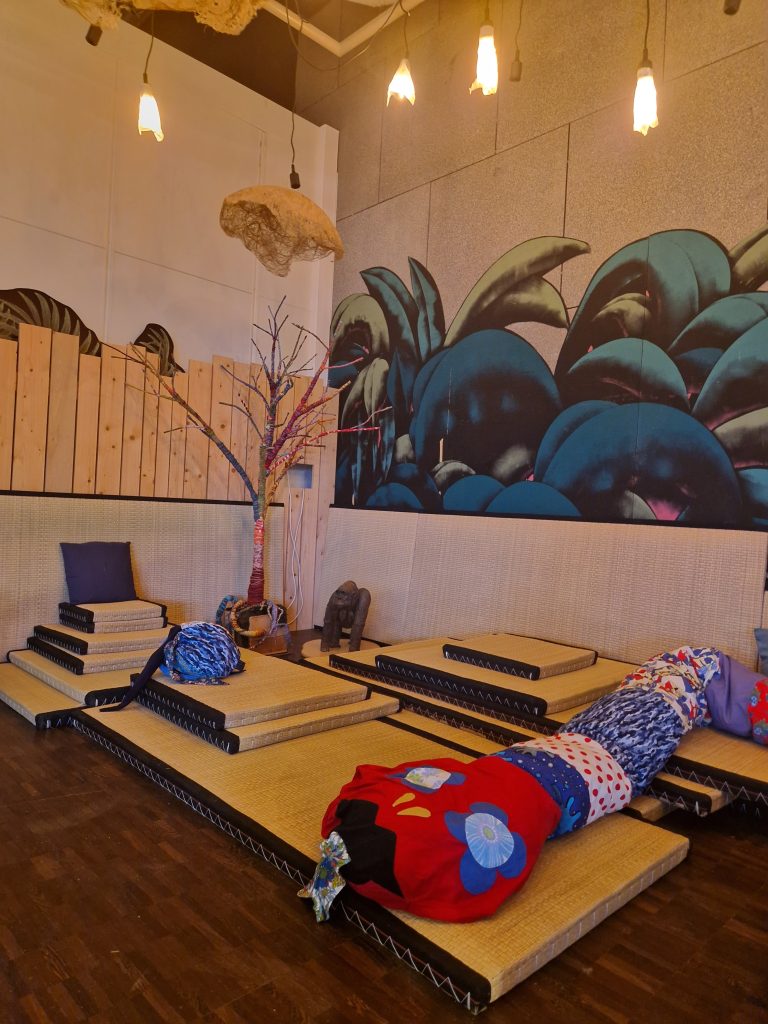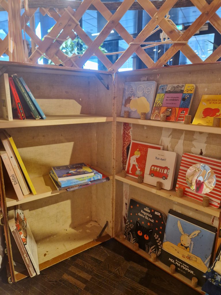 L’espace est volontairement sans plastique et sans écran, conçu à partir de matériaux naturels et de récupération.