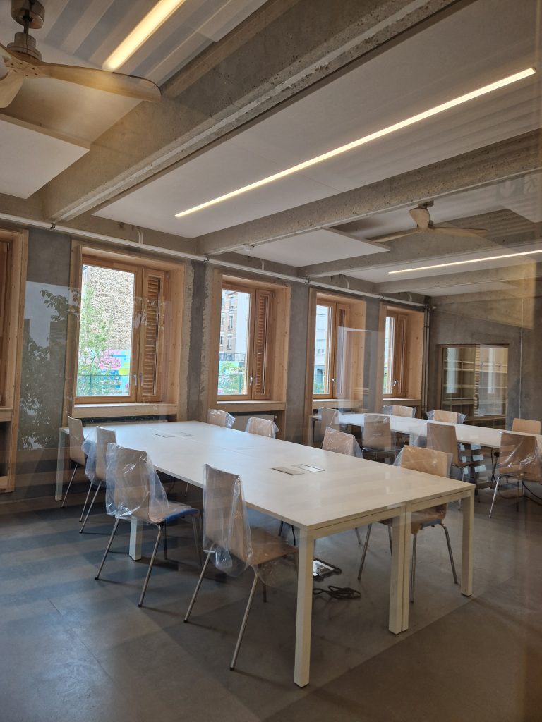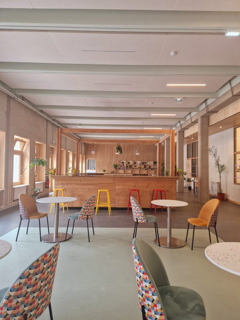 La médiathèque prend place dans l’ancien lycée hôtelier Jean-Quarré, entièrement réhabilité plutôt que démoli, un choix fort en matière d’écologie.